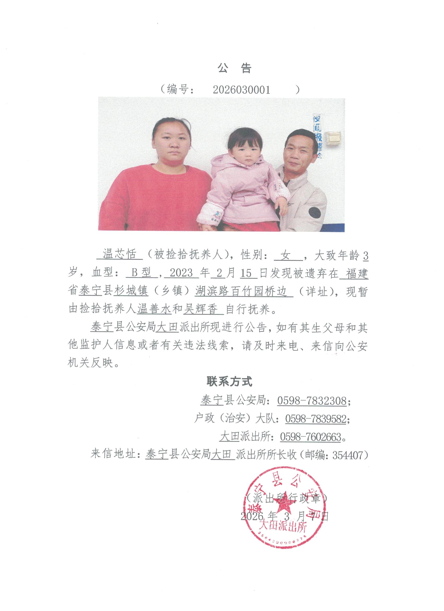 泰宁县公安局对被捡拾抚养未成年人的落户公告(1)