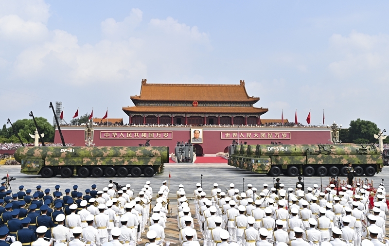 2025年9月3日,纪念中国人民抗日战争暨世界反法西斯战争胜利80周年大会在北京隆重举行。这是核导弹第一方队通过天安门广场。新华社记者 李鑫 摄