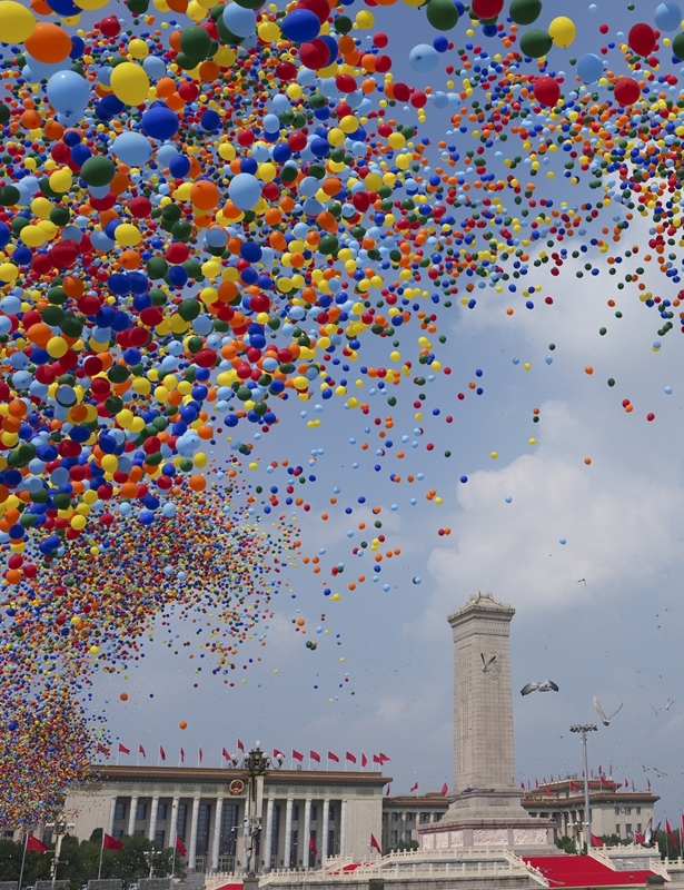 2025年9月3日,纪念中国人民抗日战争暨世界反法西斯战争胜利80周年大会在北京隆重举行。这是纪念大会现场放飞气球和鸽子。新华社记者 牟宇 摄