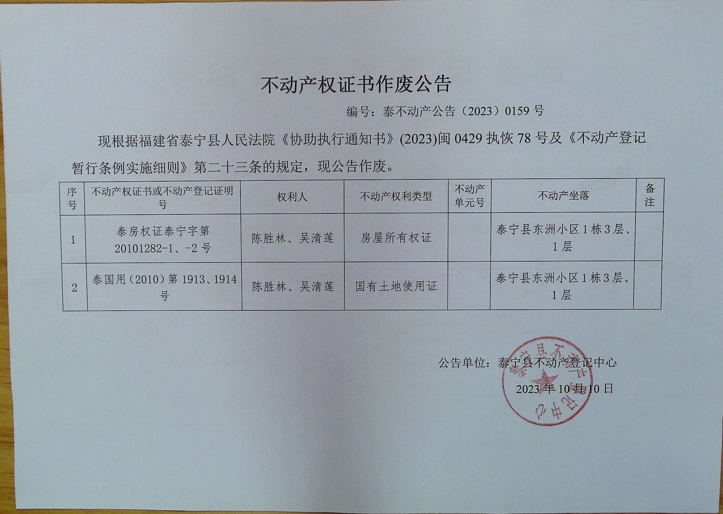 不动产权证书作废公告(陈胜林、吴清莲)159号