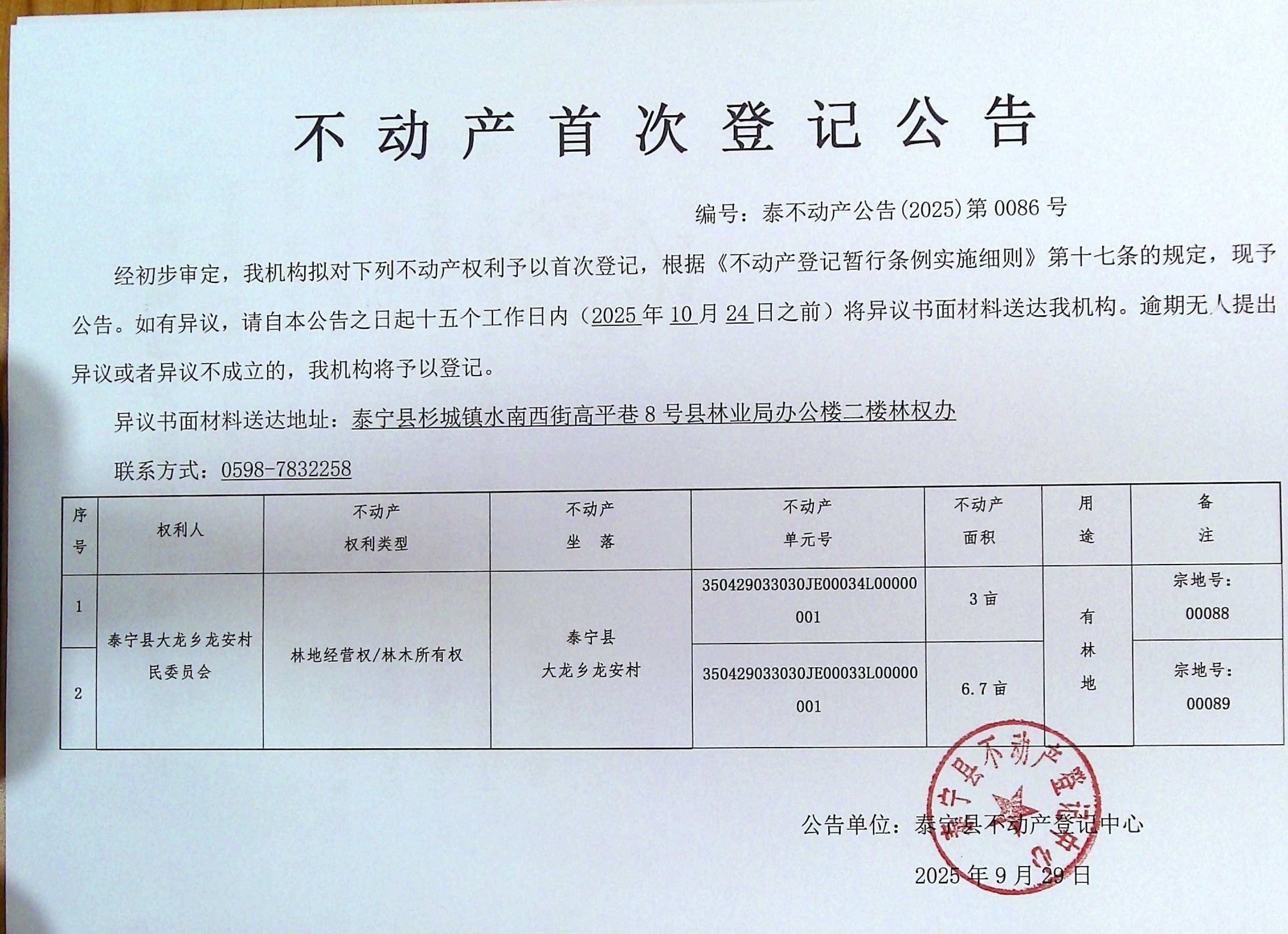 不动产首次登记公告(泰宁县大龙乡龙安村民委员会 林权)86号