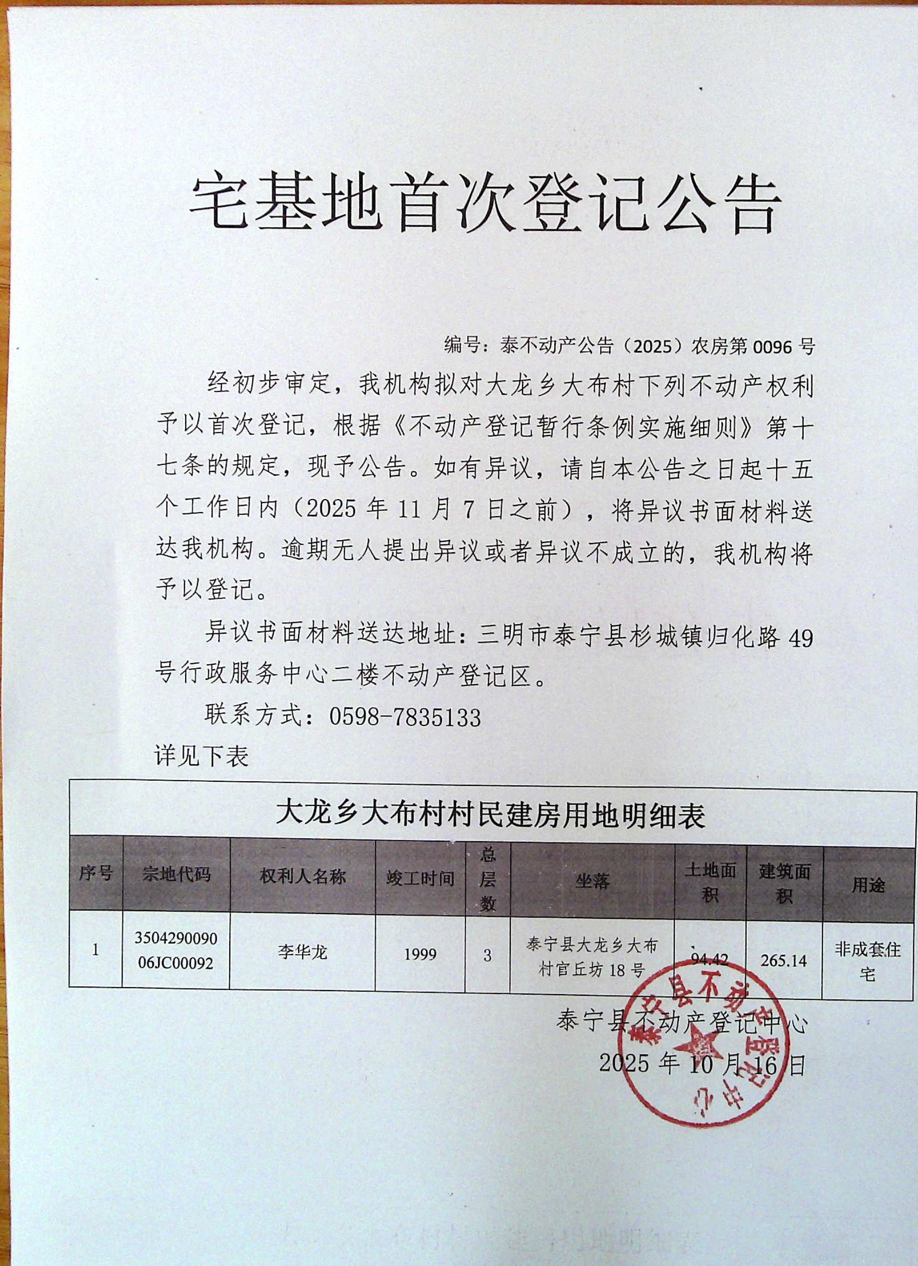 宅基地首次登记公告(李华龙)96号