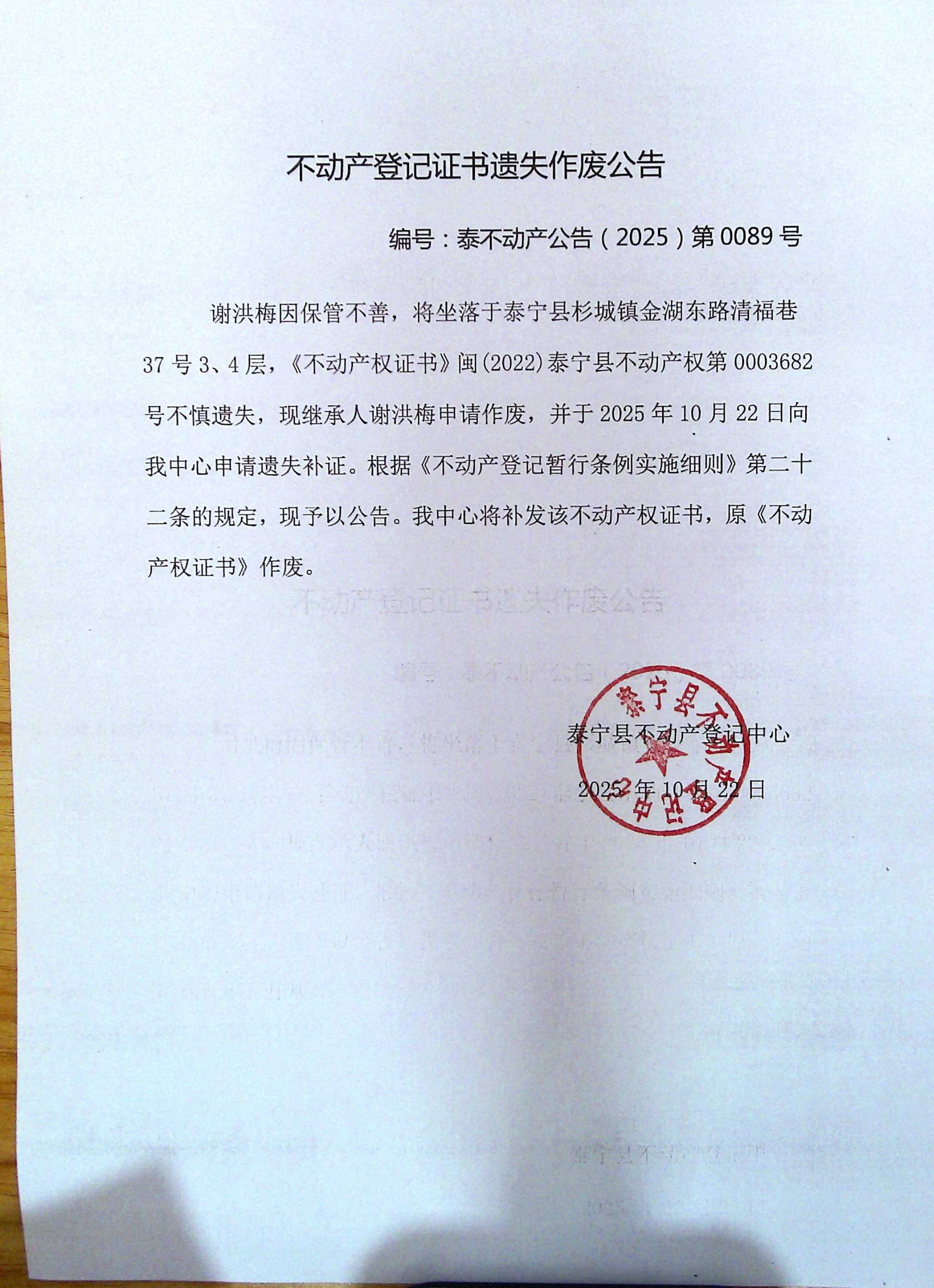不动产登记证书遗失作废公告(谢洪梅)89号