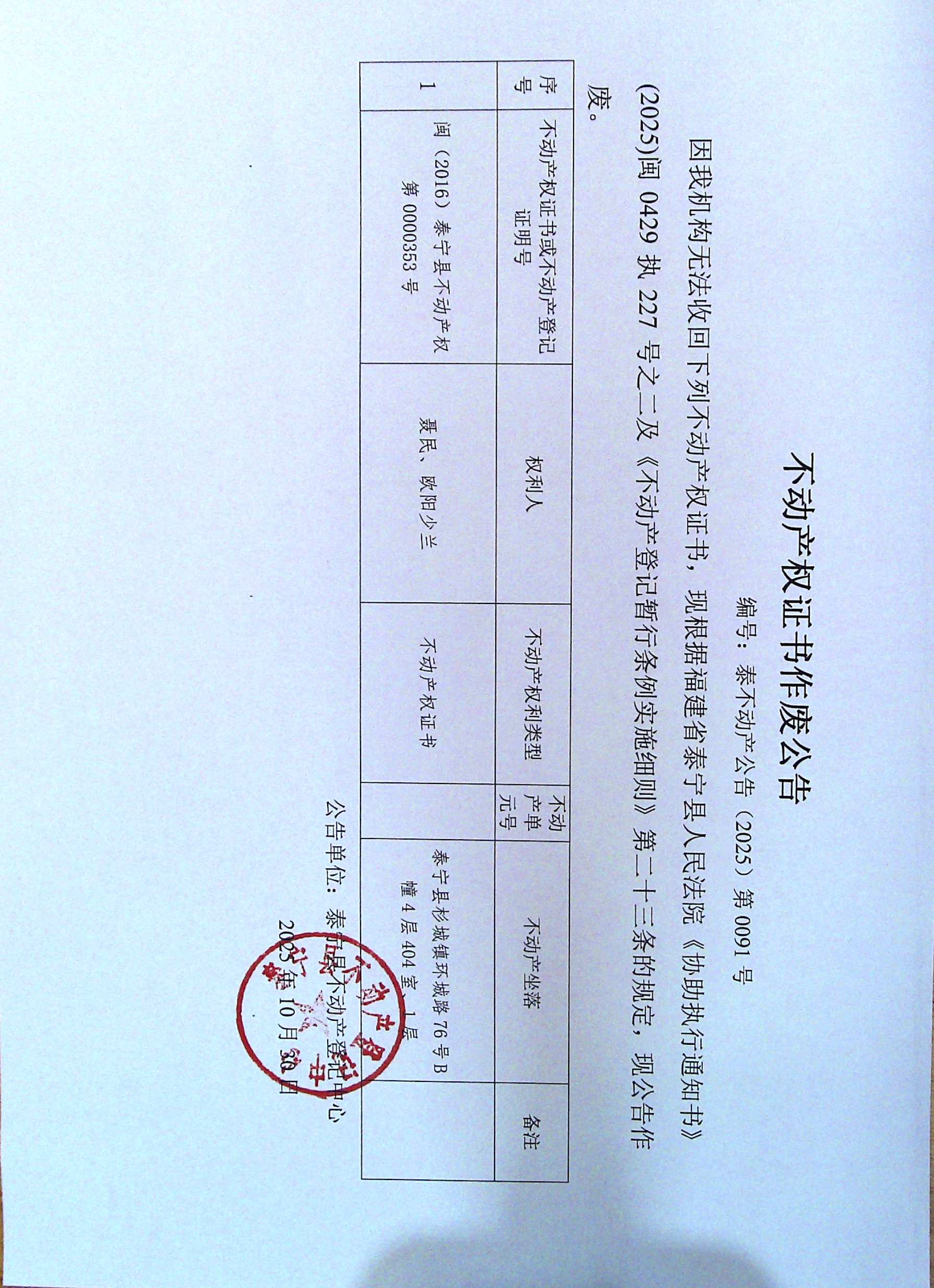 不动产权证书作废公告(聂民、欧阳少兰)91号