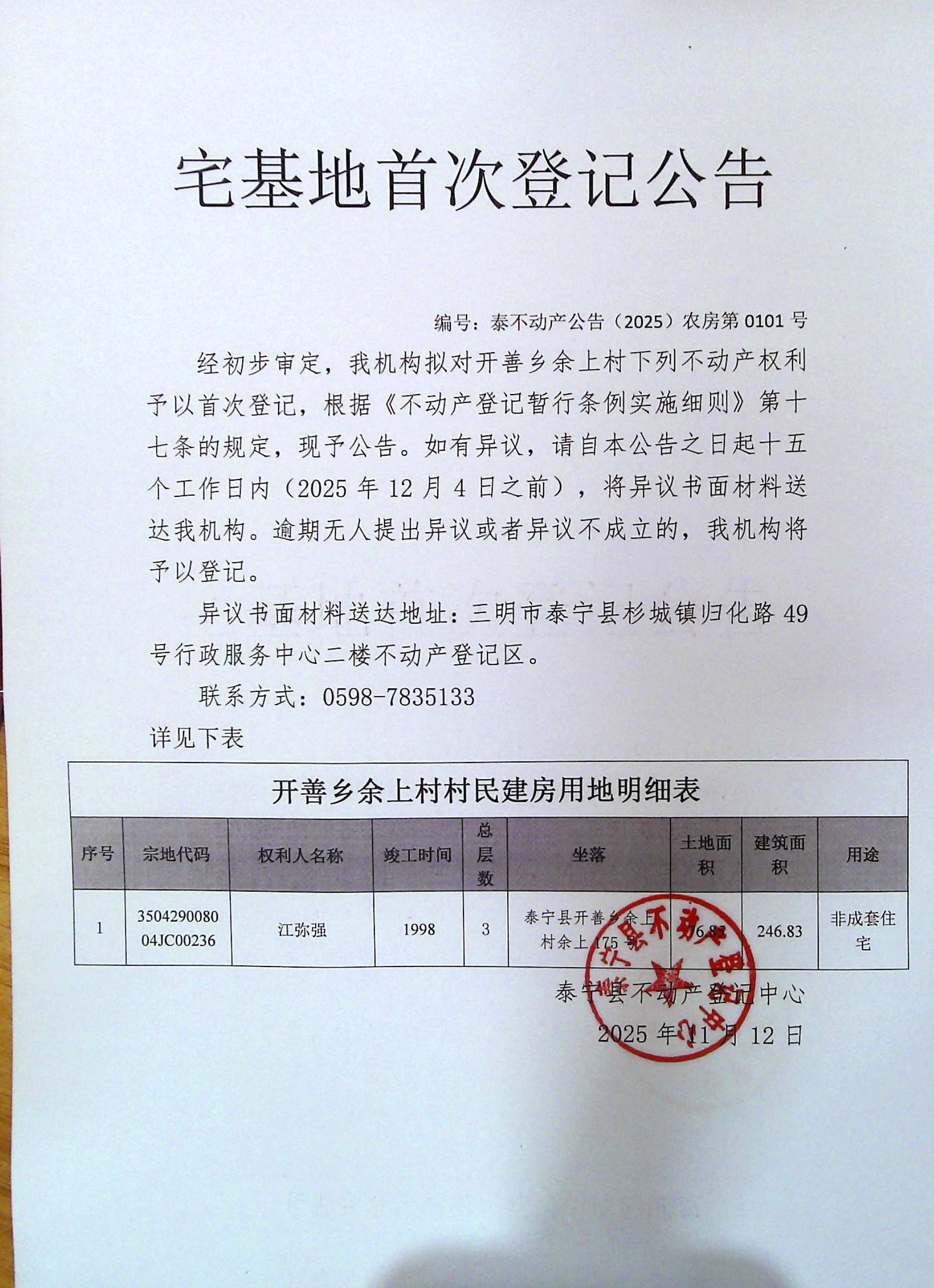 宅基地首次登记公告(江弥强)101号