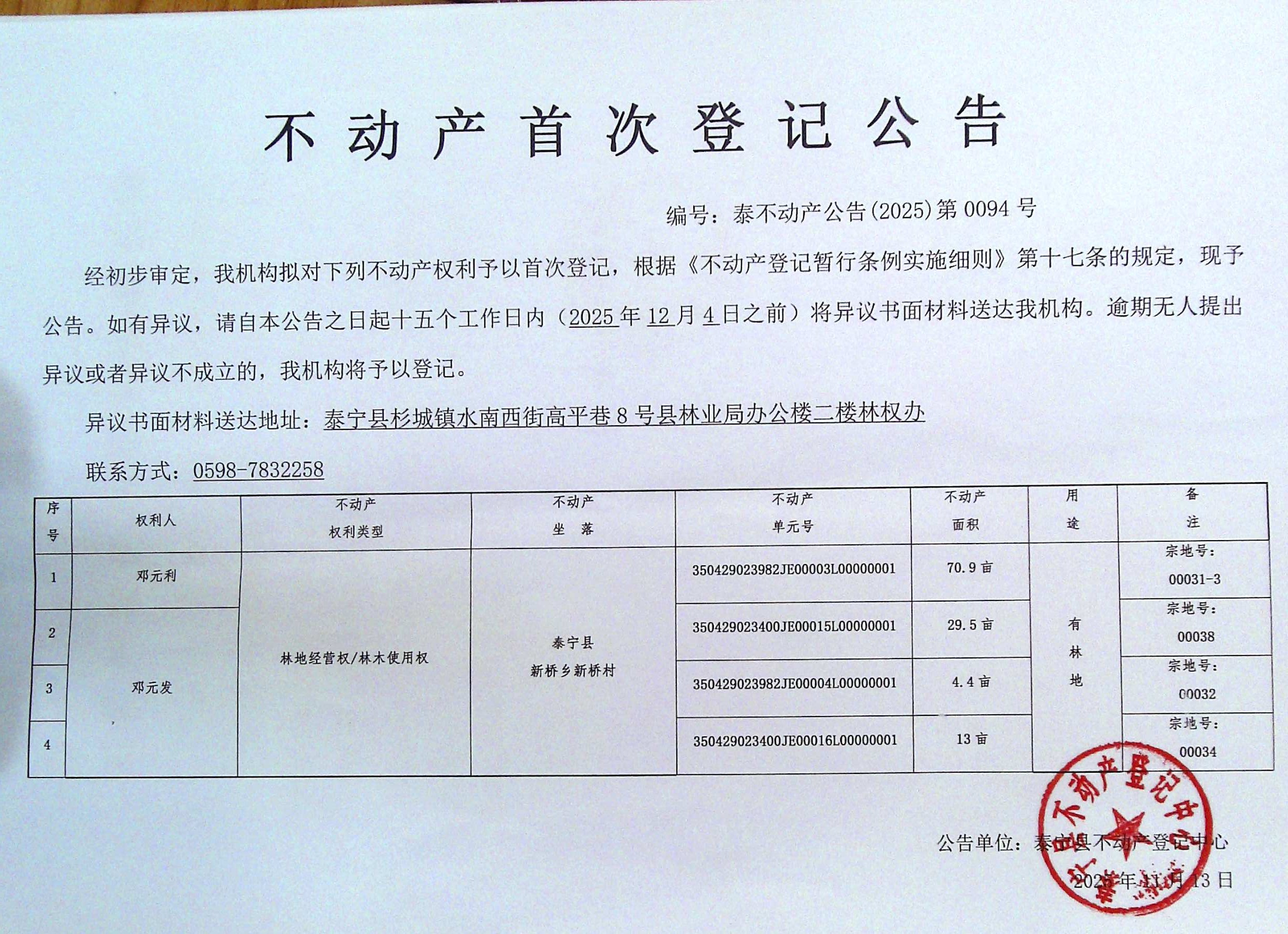 不动产首次登记公告(邓元利、邓元发 林权)94号