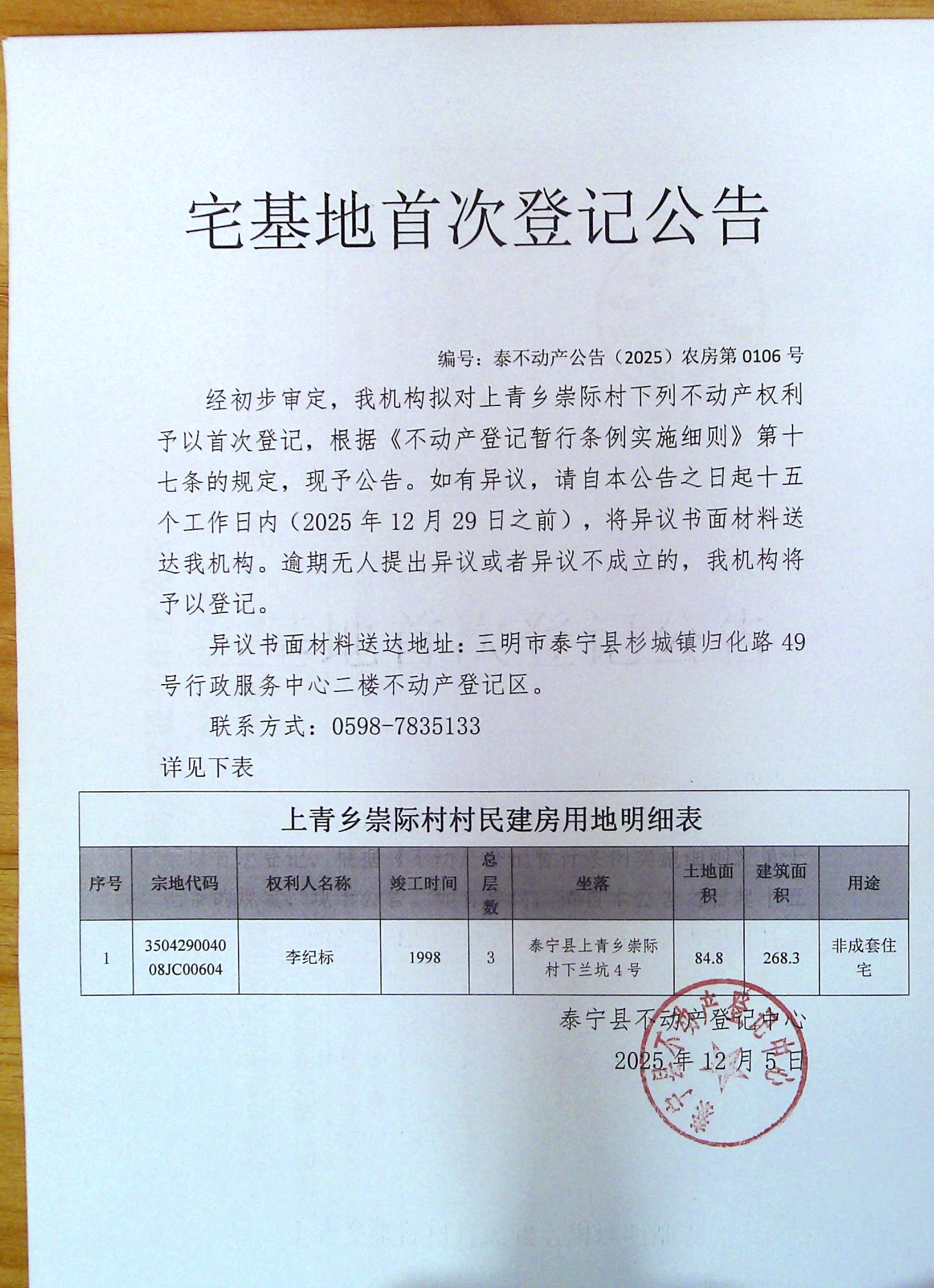 宅基地首次登记公告(李纪标)106号
