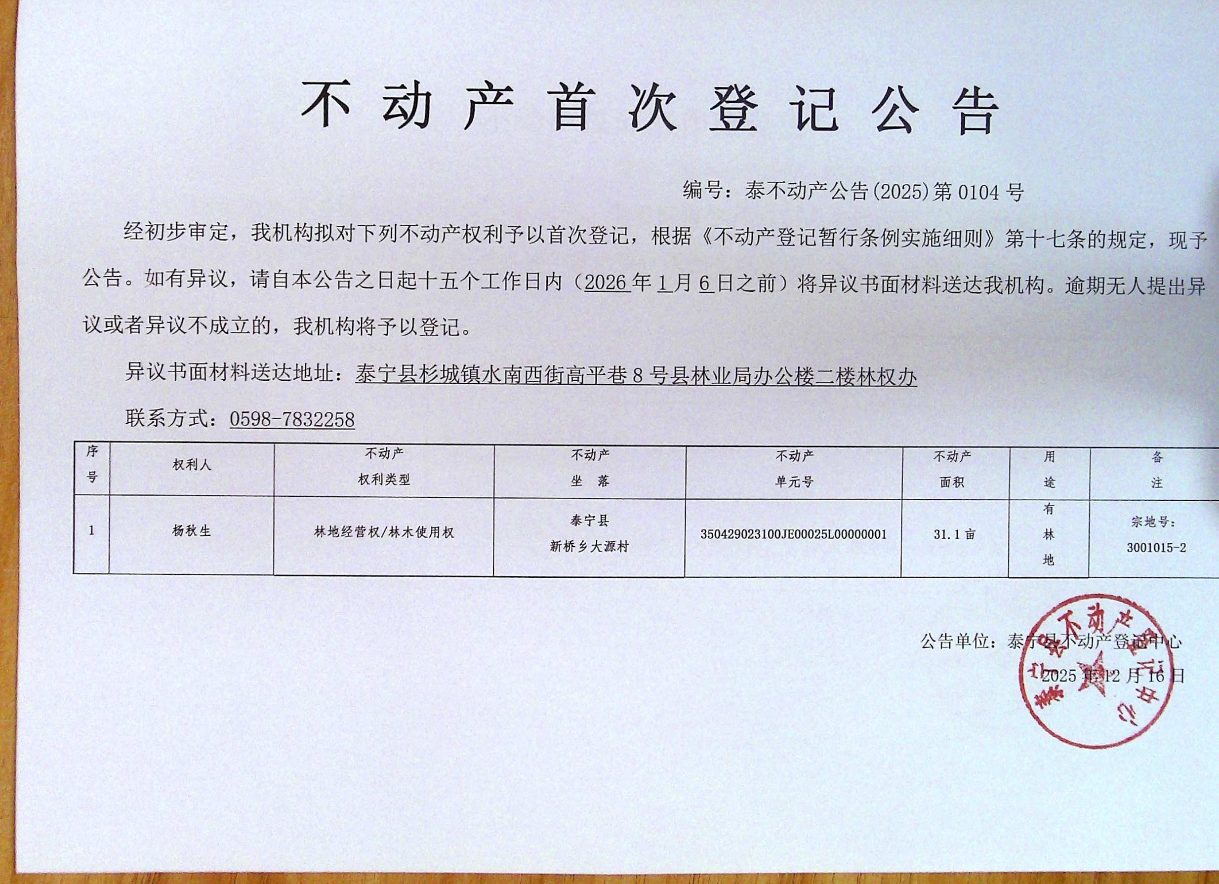 不动产首次登记公告(杨秋生 林权)104号