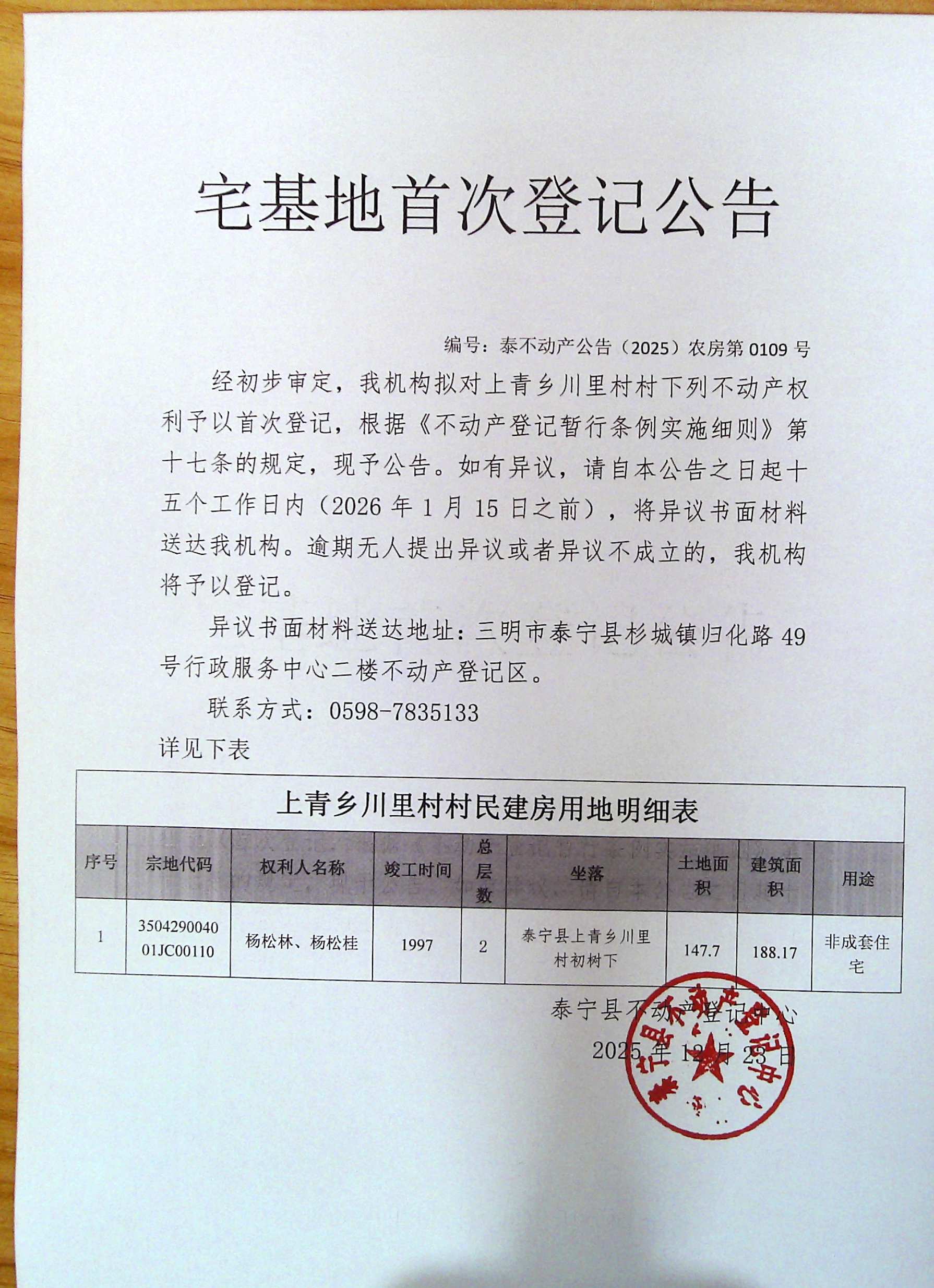 宅基地首次登记公告(杨松林、杨松桂)109号