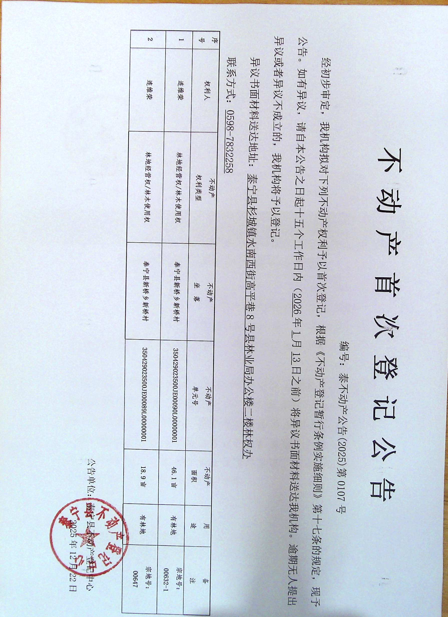 不动产首次登记公告(连维荣 林权)107号