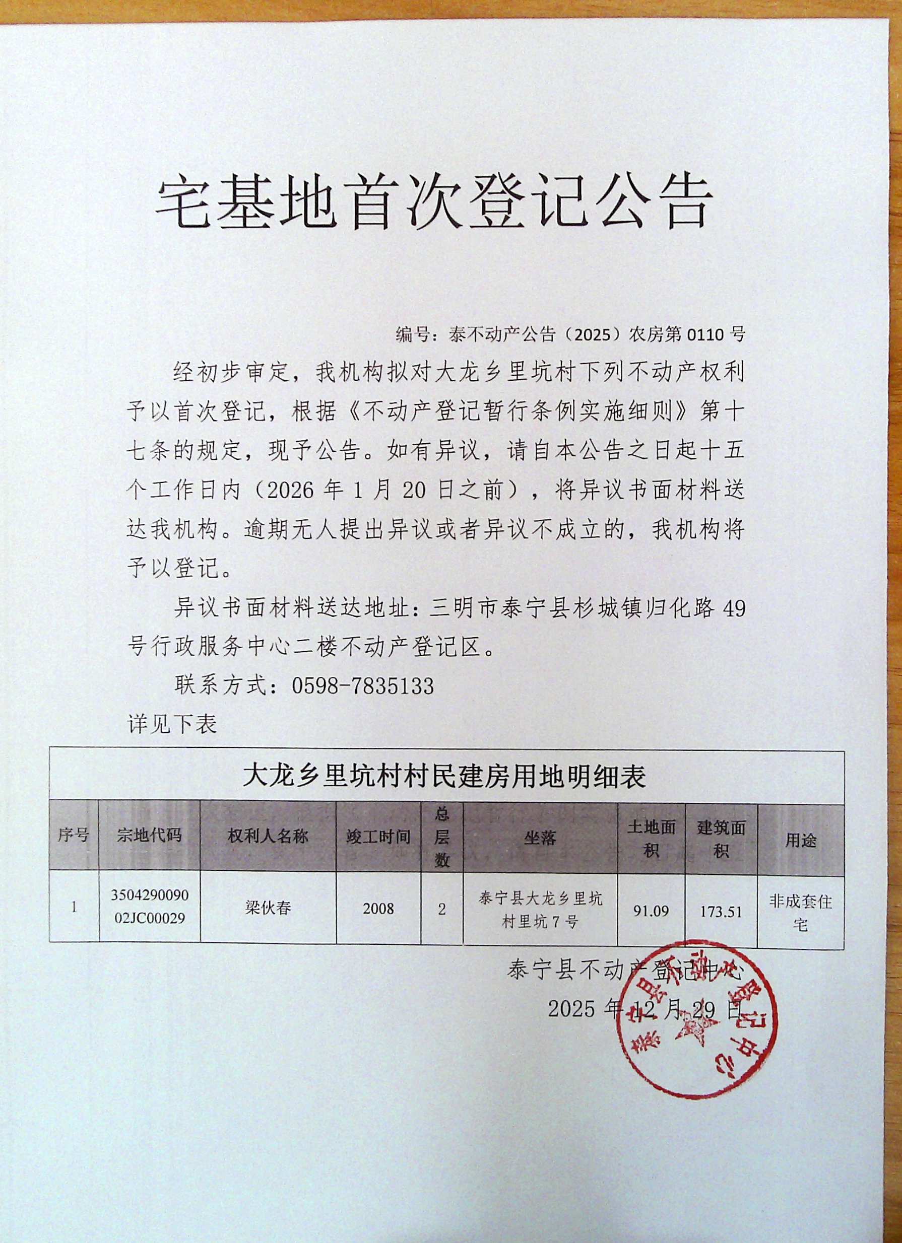 宅基地首次登记公告(梁伙春)110号
