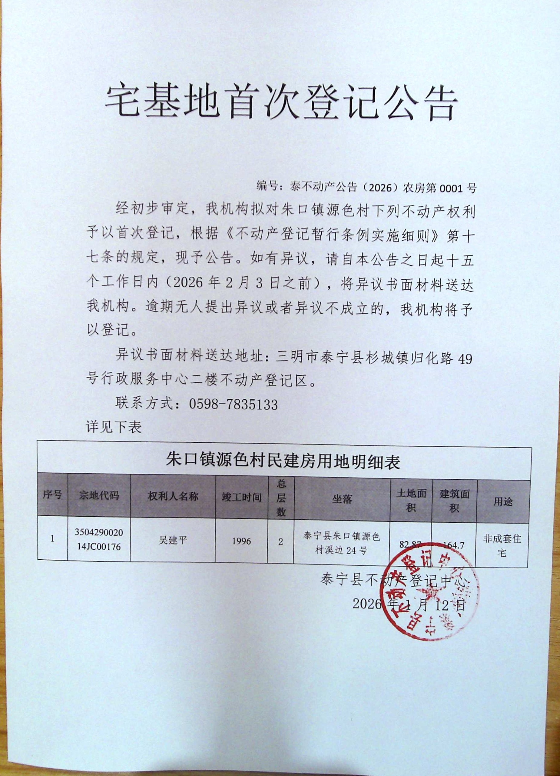 宅基地首次登记公告(吴建平)1号
