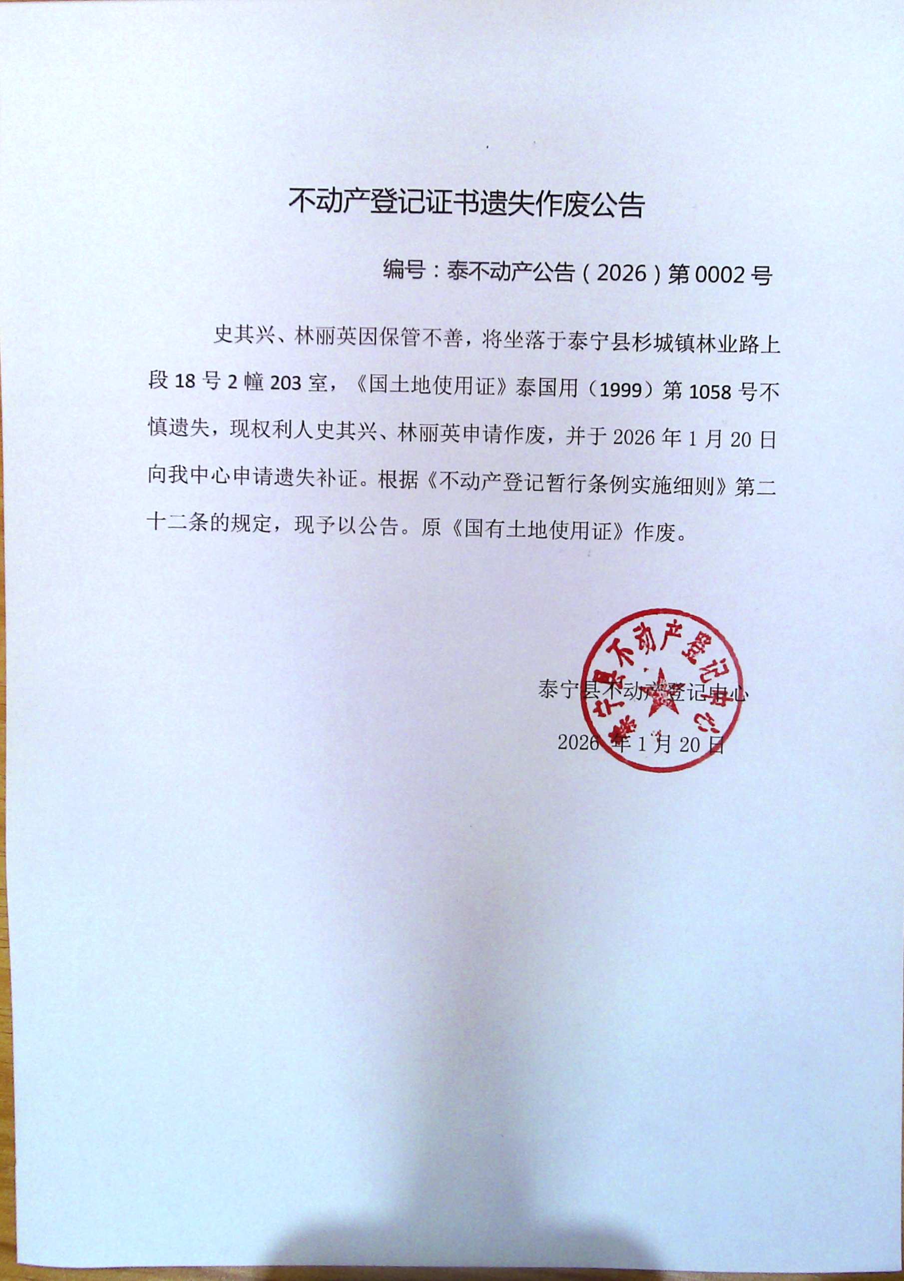 不动产登记证书遗失作废公告(史其兴、林丽英)2号