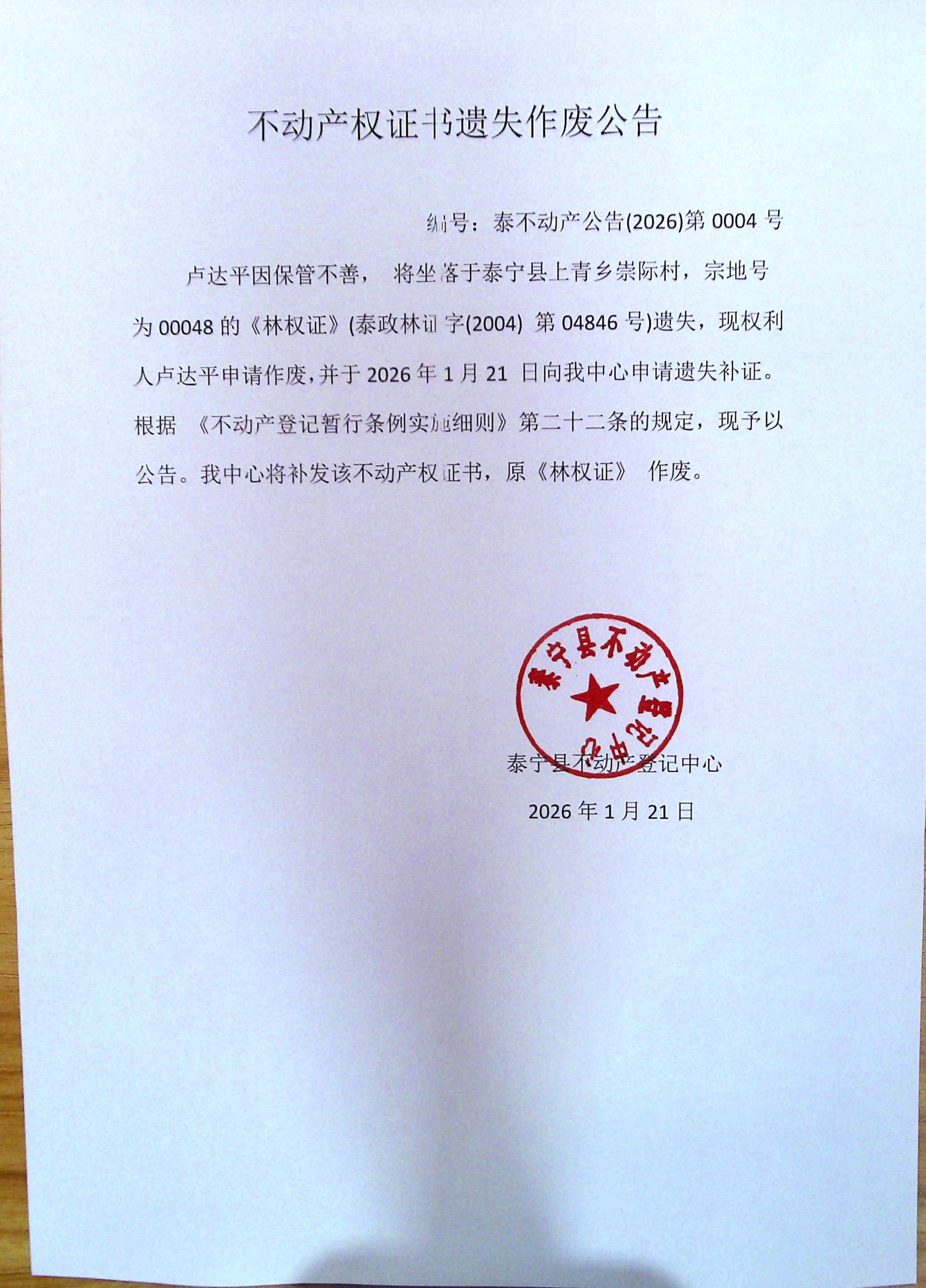 不动产权证书遗失作废公告(卢达平 林权)4号