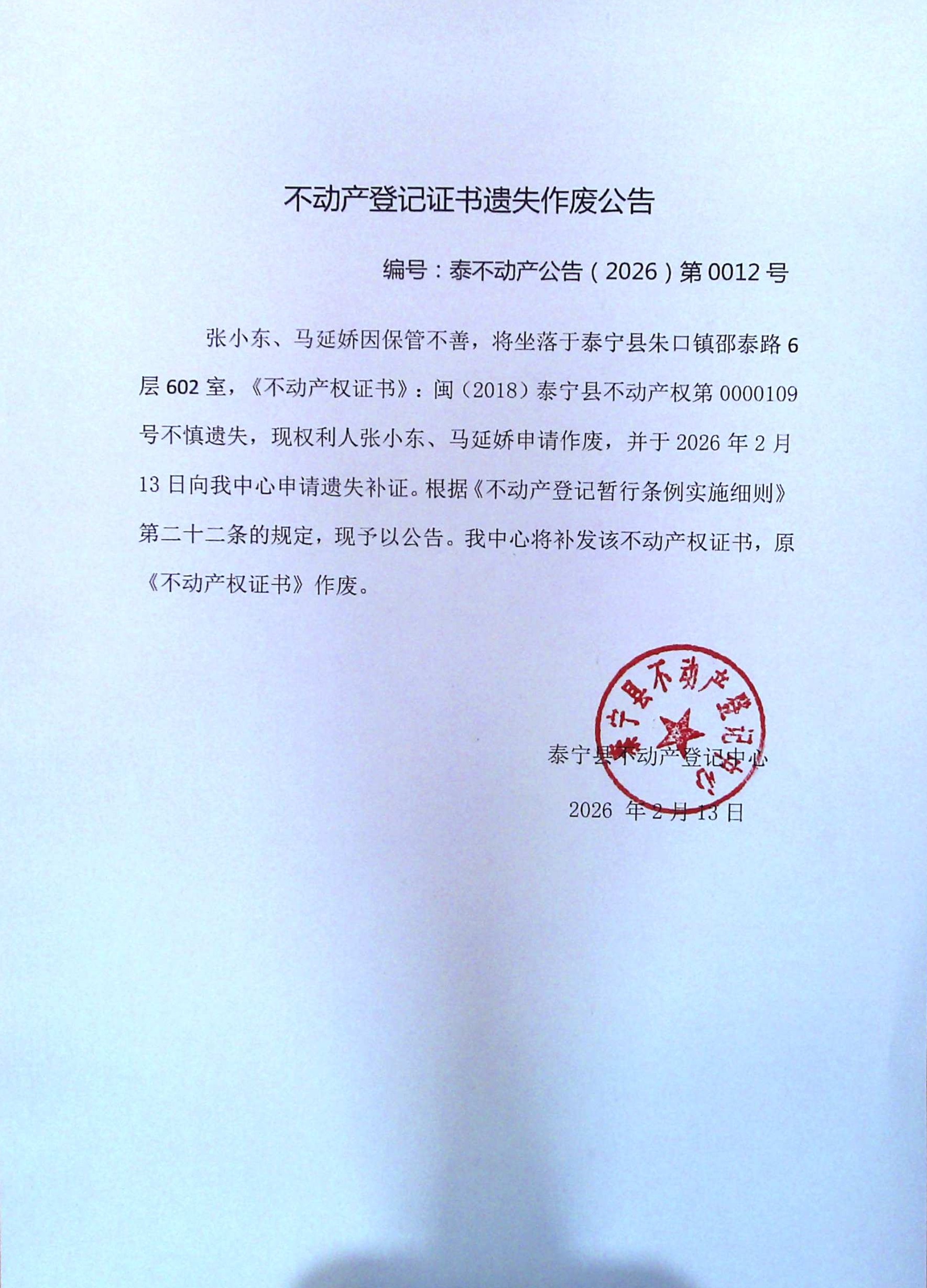 不动产权证书遗失作废公告(张小东、马延娇)12号