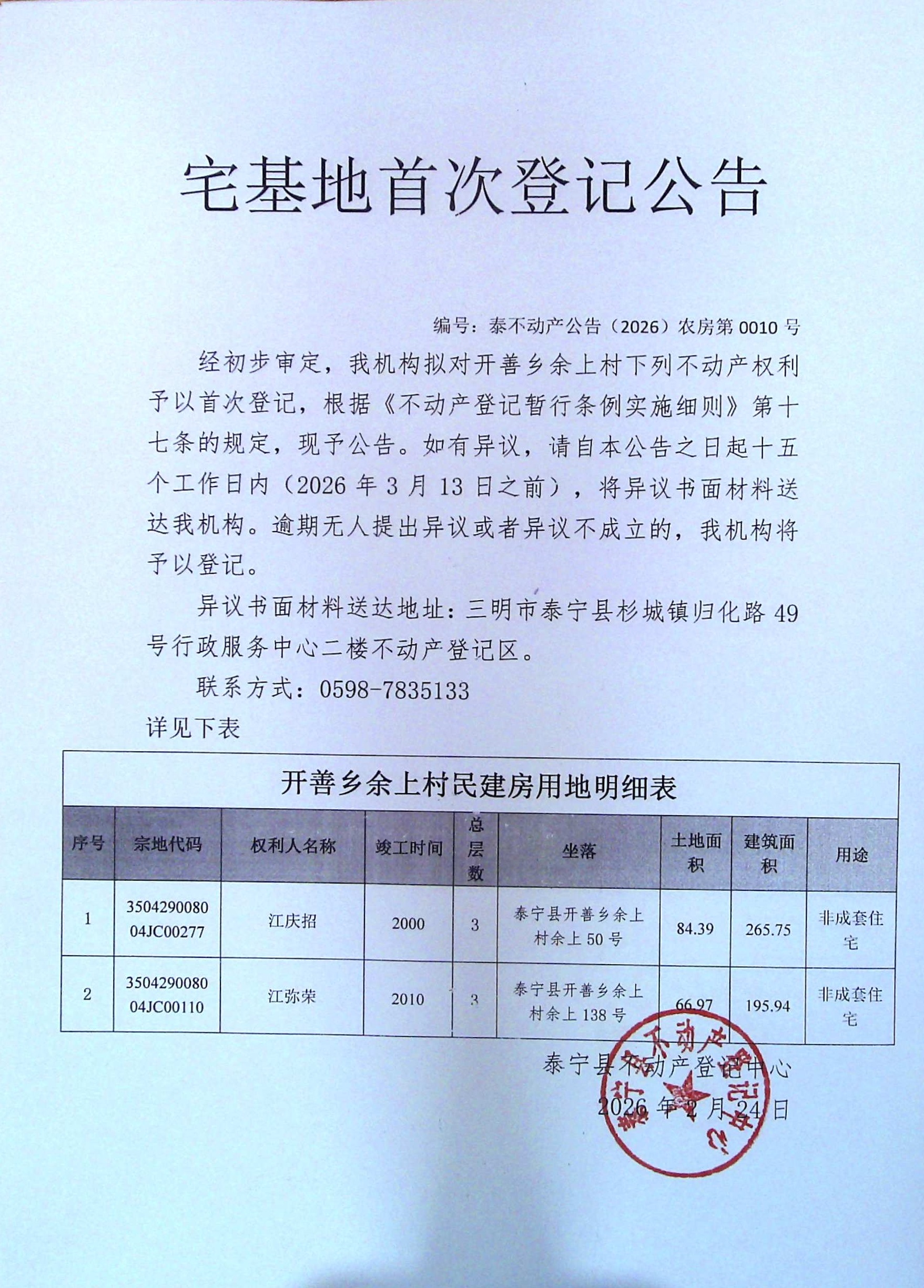 宅基地首次登记公告(江庆招、江弥荣)10号