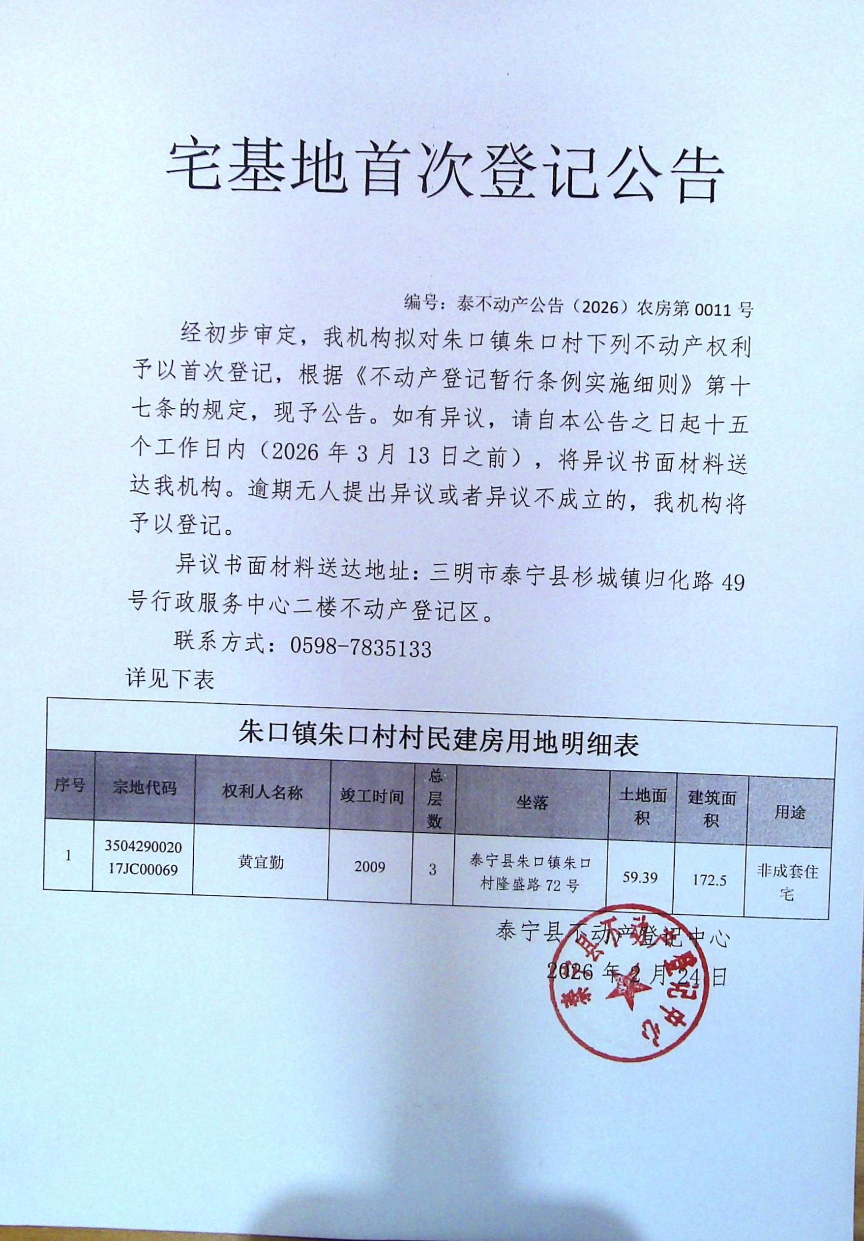 宅基地首次登记公告(黄宜勤)11号
