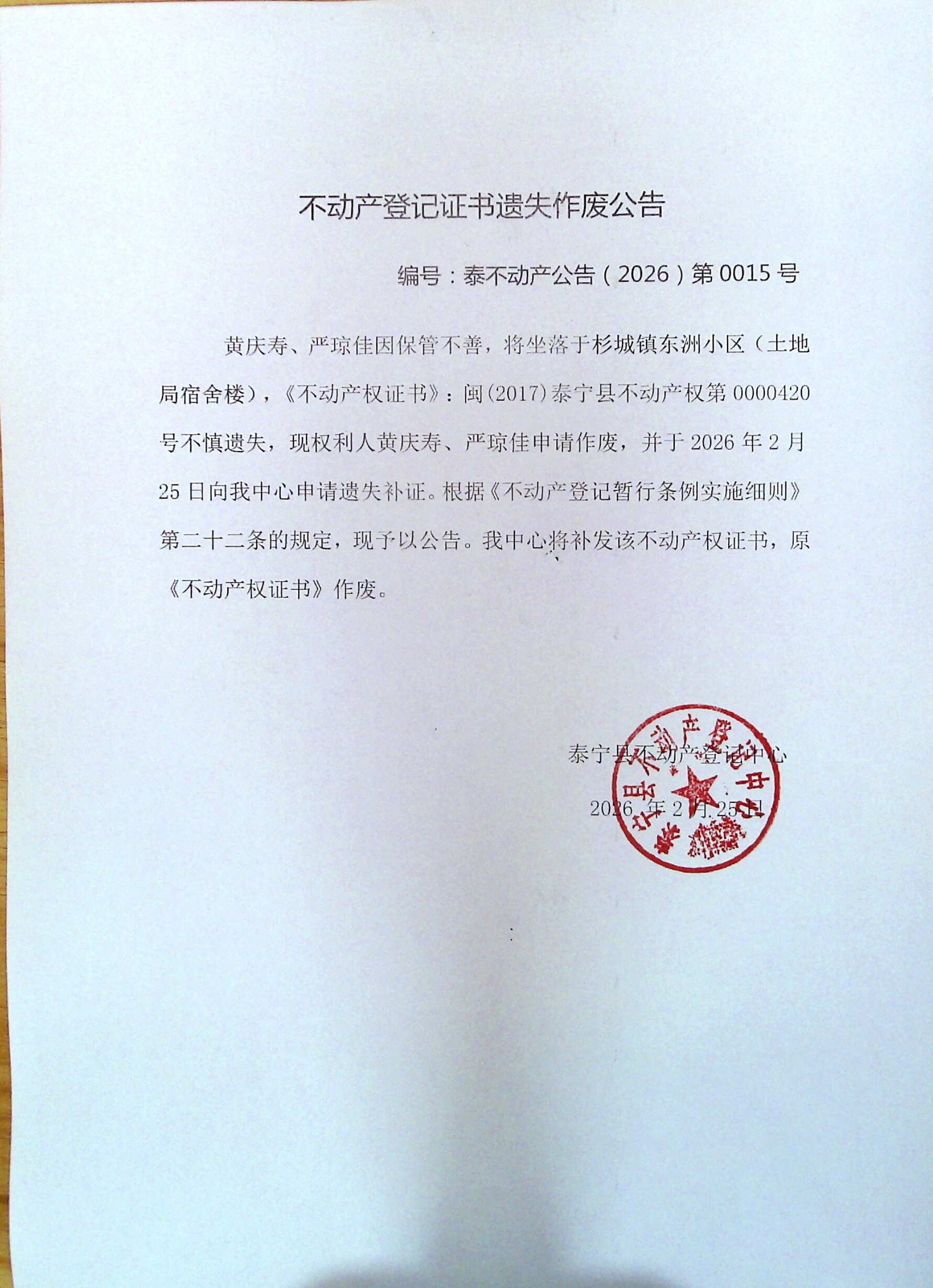 不动产权证书遗失作废公告(黄庆寿、严琼佳)15号