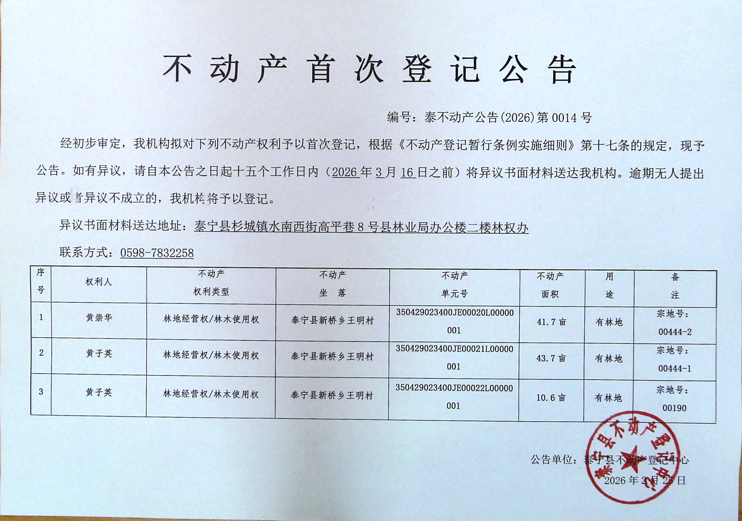 不动产首次登记公告(黄崇华、黄子英 林权)14号
