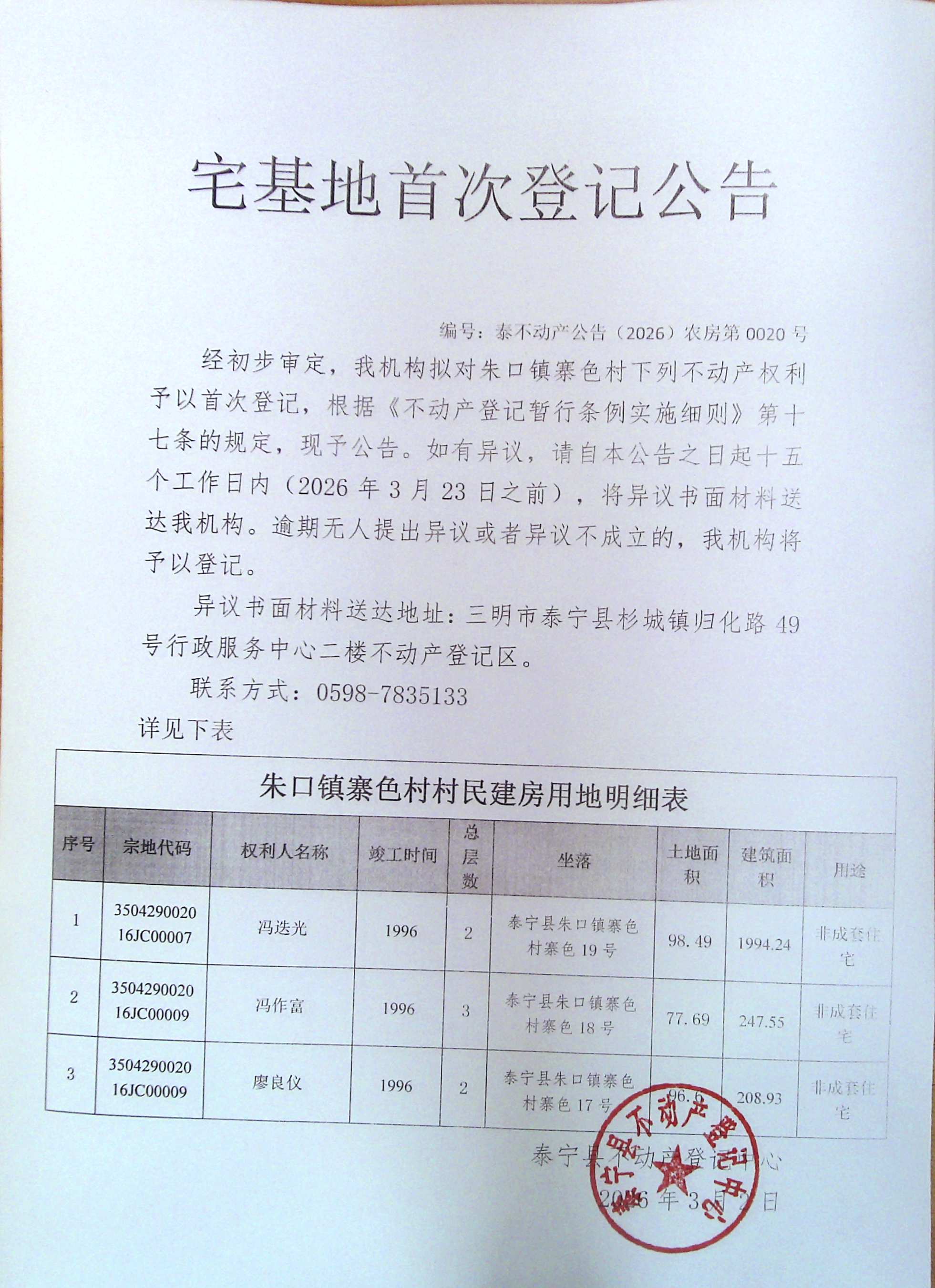 宅基地首次登记公告(冯迭光、冯作富、廖良仪)20号
