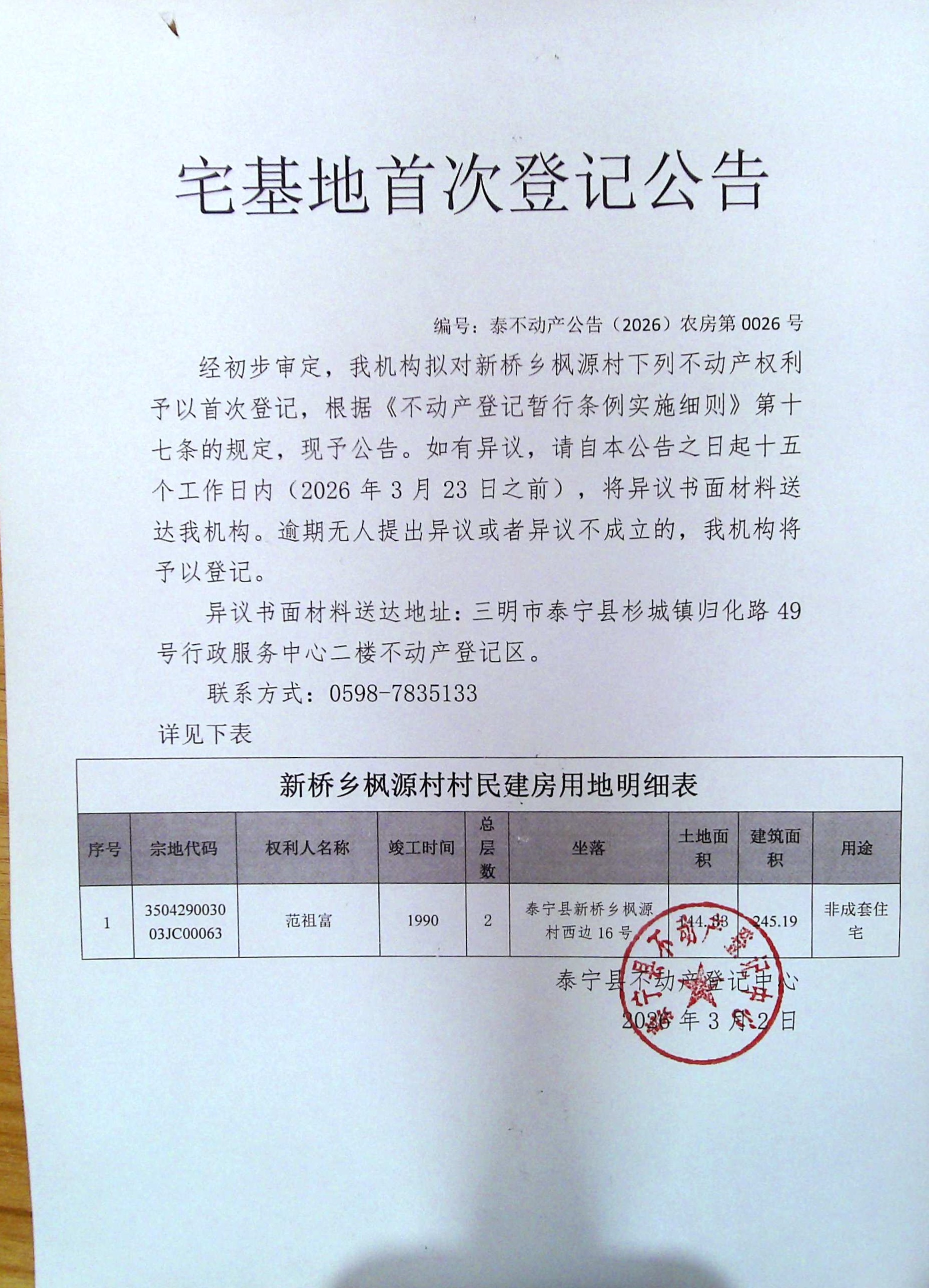 宅基地首次登记公告(范祖富)26号