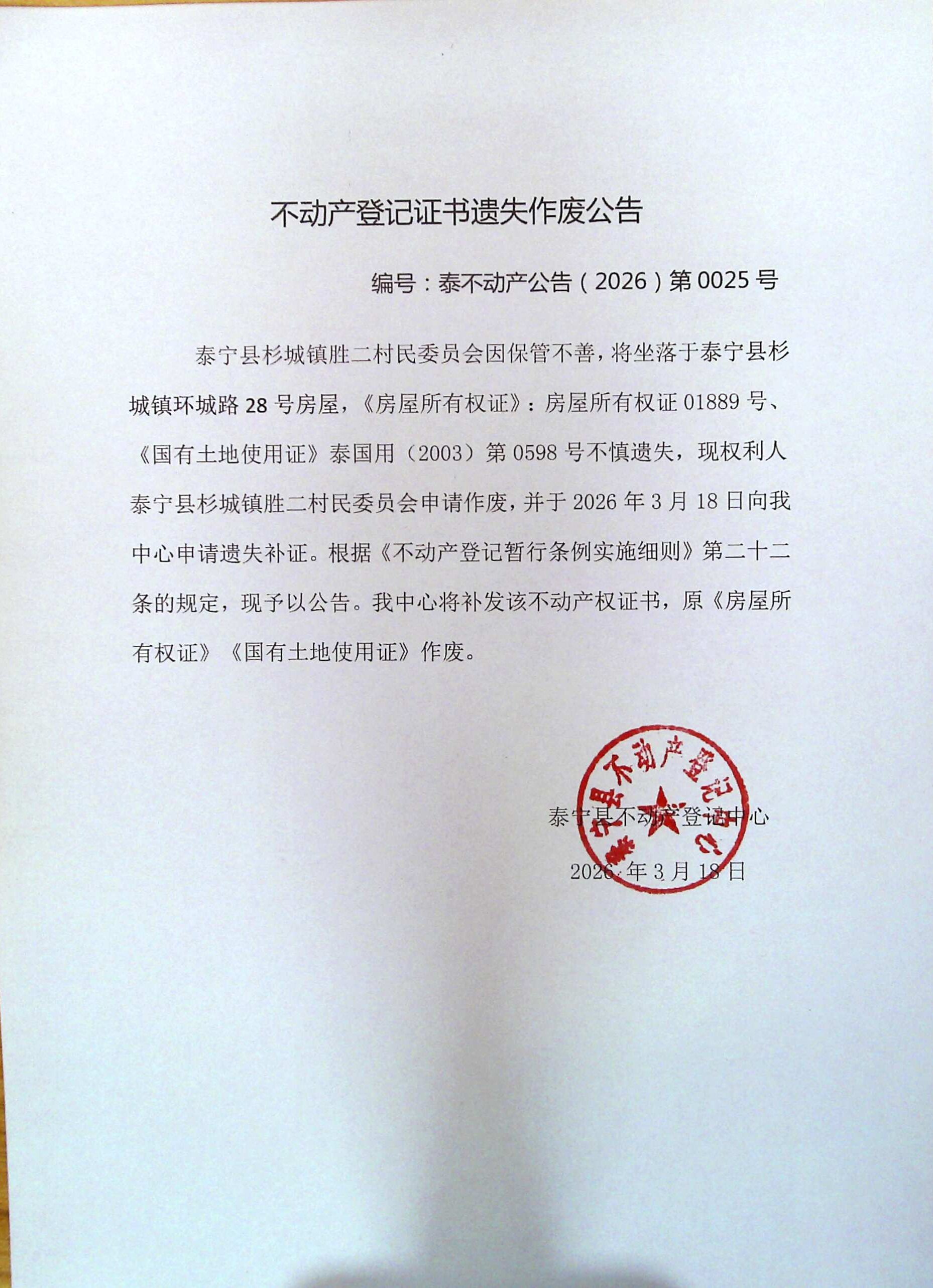 不动产权证书遗失作废公告(泰宁县杉城镇胜二村民委员会)25号