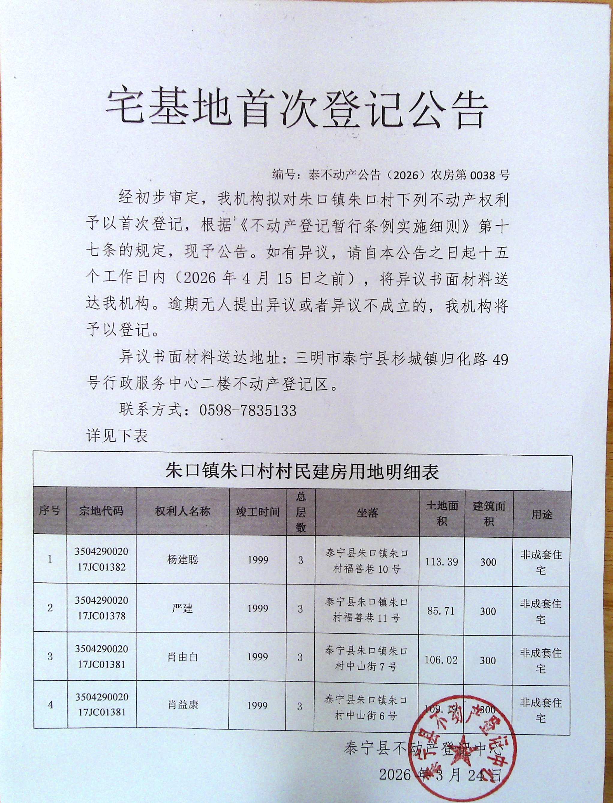 宅基地首次登记公告(杨建聪、严建、肖由白、肖益康)38号