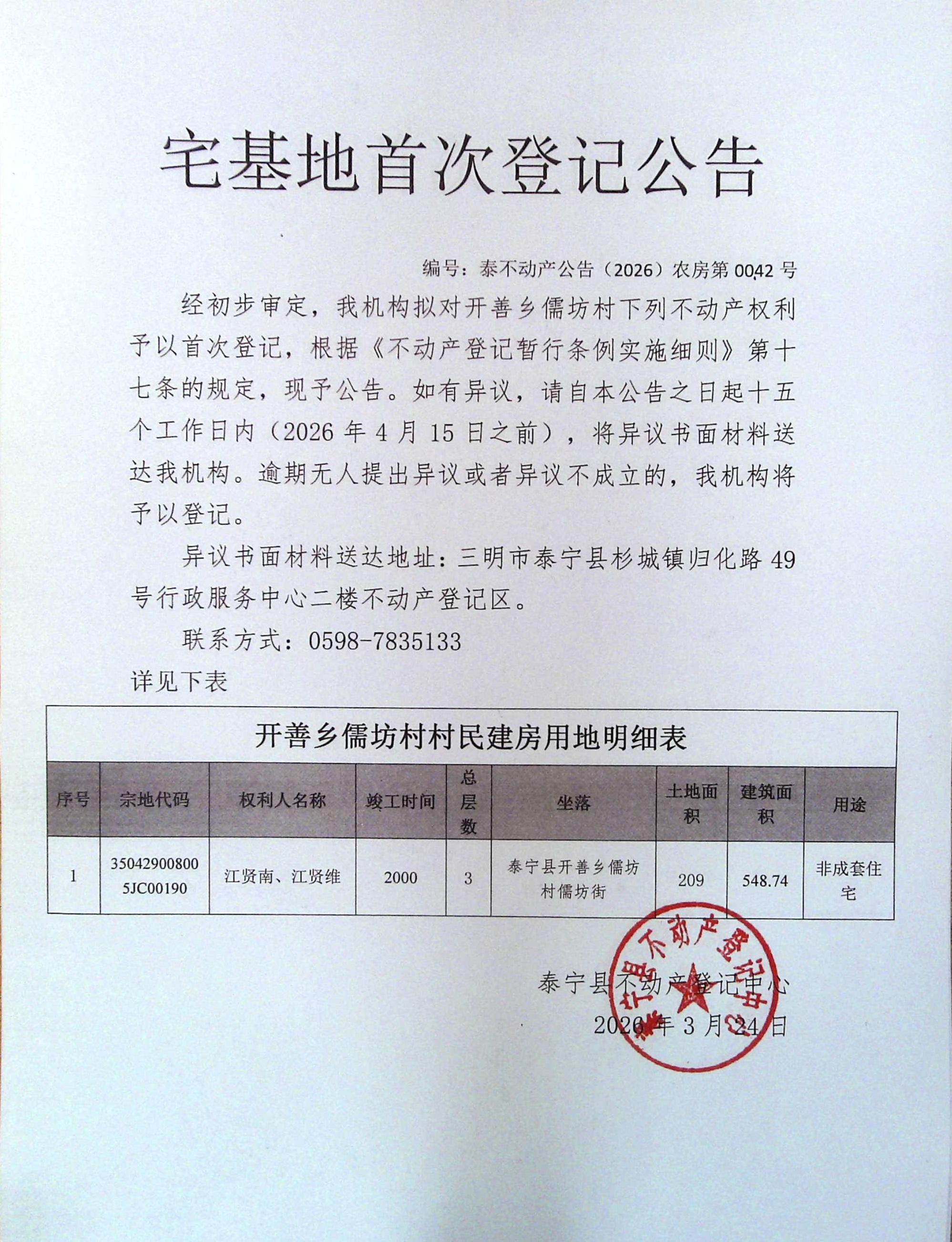 宅基地首次登记公告(江贤南、江贤维)42号