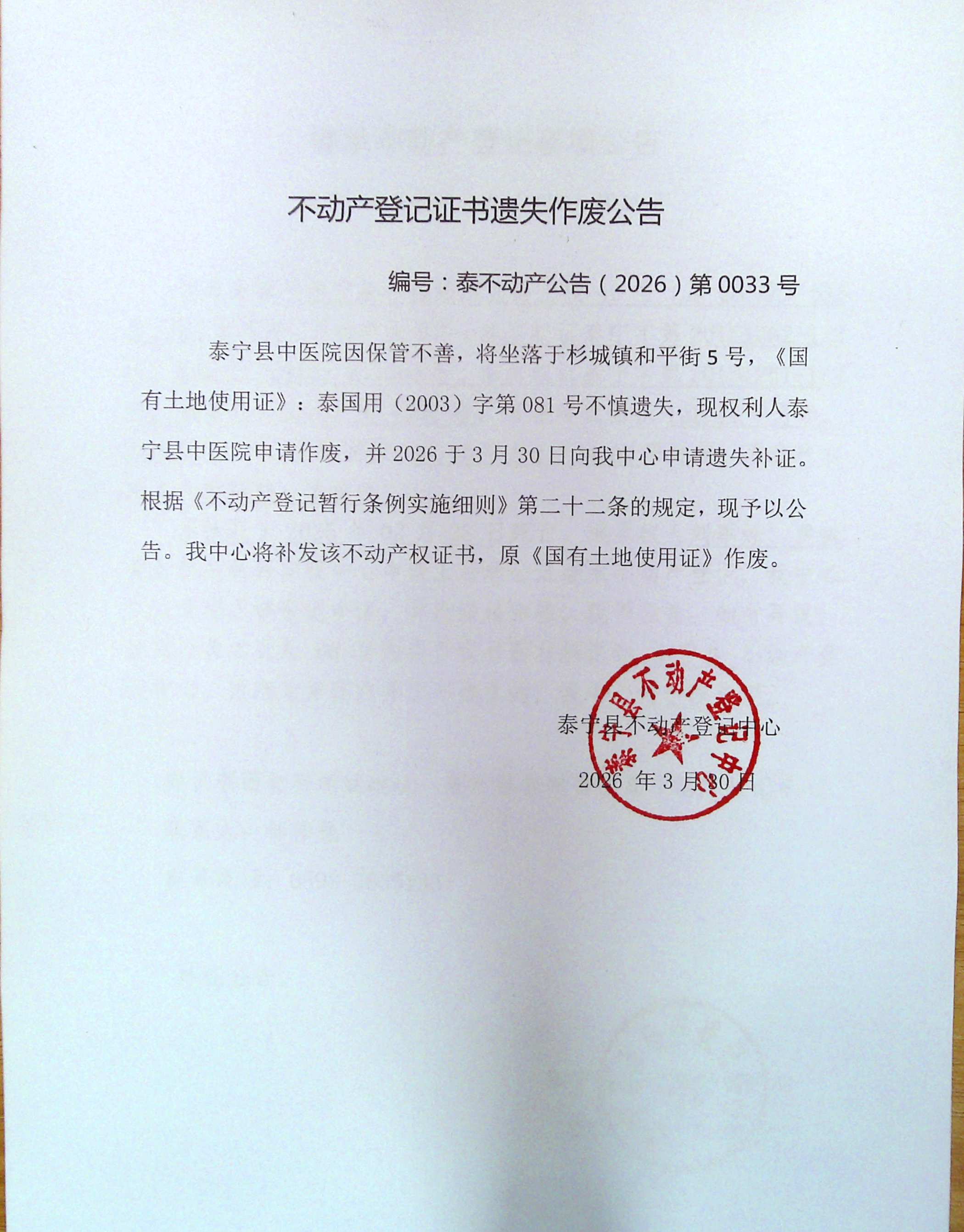 不运产登记证书遗失作废公告(泰宁县中医院)33号