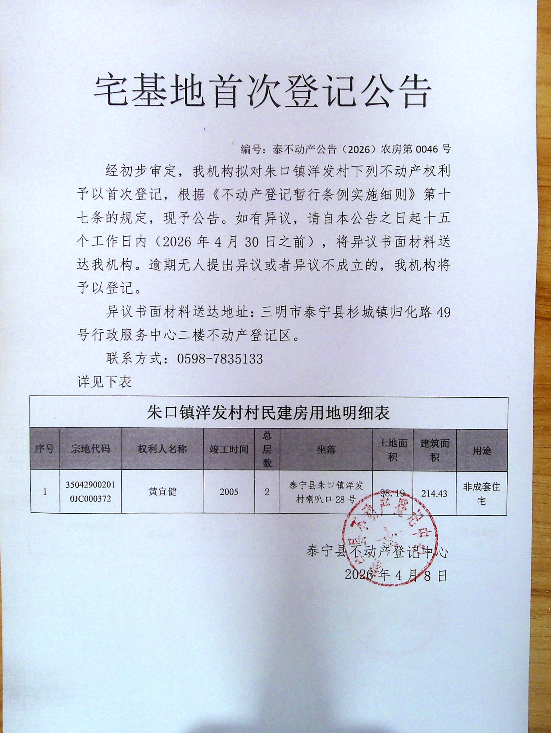 宅基地首次登记公告(黄宜健)46号