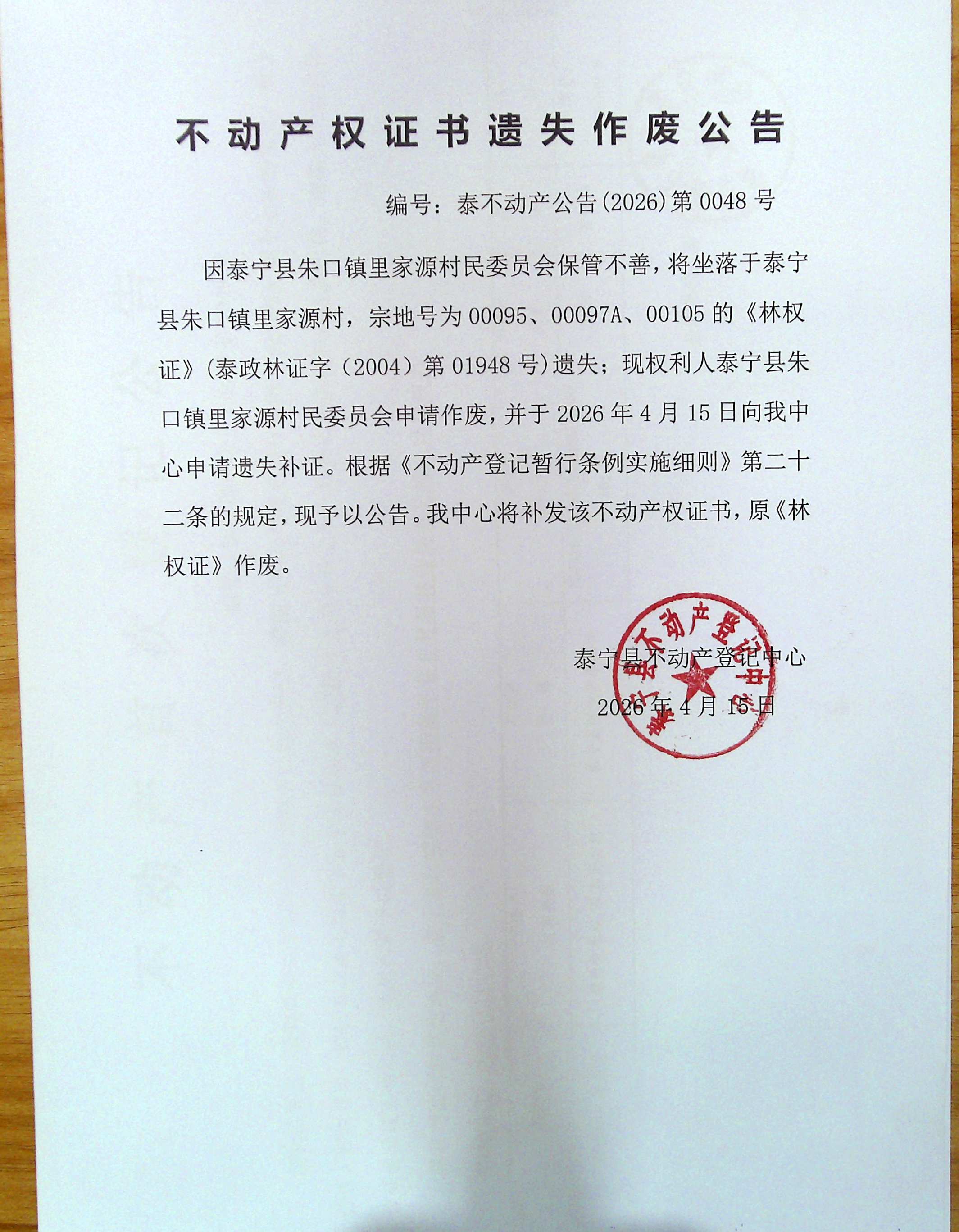不动产权证书遗失作废公告(泰宁县朱口镇里家源村民委员会 林权)48号